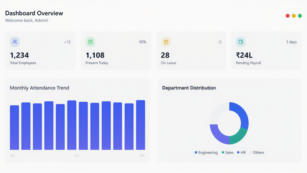 A centralized dashboard that gives HR teams complete control over employees, attendance, payroll and compliance.