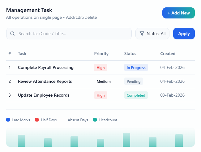 Manage all HR operations from a single page. Add, edit, delete, and track tasks with powerful search, filters, and real-time analytics.